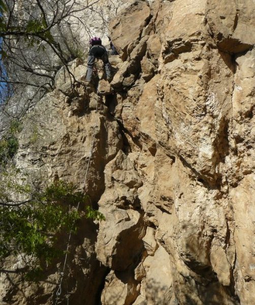 Fatte le dovute valutazioni potete continuare per un altro diedro verticale con buoni punti di appoggio artificiali e naturali. Affrontata quest’altra difficoltà, si arriva a un successivo punto impegnativo. Anche questo non deve essere sottovalutato. Anzi, in tutta la ferrata, non si devono mai sottovalutare le difficoltà. Un traverso detto “del gufo” ci conduce su un’altra parete. Questa è chiamata “camino delle gemelle”. Qui, le difficoltà mettono ancora una volta a dura prova il fisico.