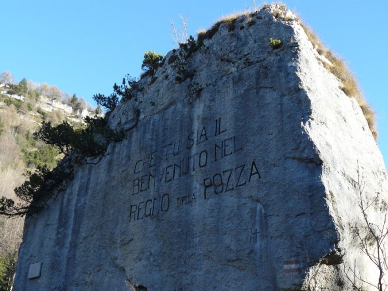 “Che tu sia il benvenuto nel regno della Pozza”. Sta scolpito nel “Sassom”, l’enorme masso. Questo masso è posto alla fine della Valle del Chèserle. È la soglia di un territorio incontaminato come quello del Pazul. In molti oggi vorrebbero vederlo elevato a parco naturale. Il reggimento Pionieri austriaci fece l’incisione. Costruirono nel 1912 la carrareccia che porta al rifugio Vincenzo Lancia (oggi contrassegnato con il n° 101 SAT/CAI).