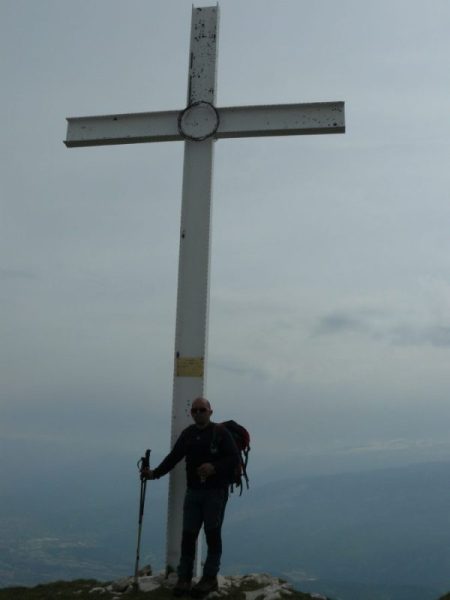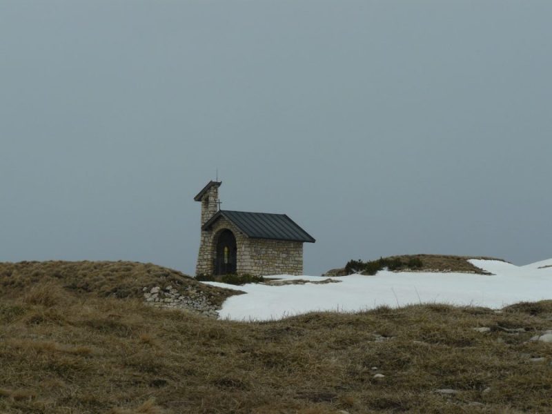 Continuo la salita fino ad arrivare alla sommità del costone. Qui, si vede la chiesetta. A sinistra, verso sud-ovest, si trova il rifugio Damiano Chiesa. Spostandomi in direzione della chiesetta, posso ammirare il Lago di Garda. Bellissimo panorama peccato per la nebbia che continua a passarmi davanti come un velo portato dal vento.