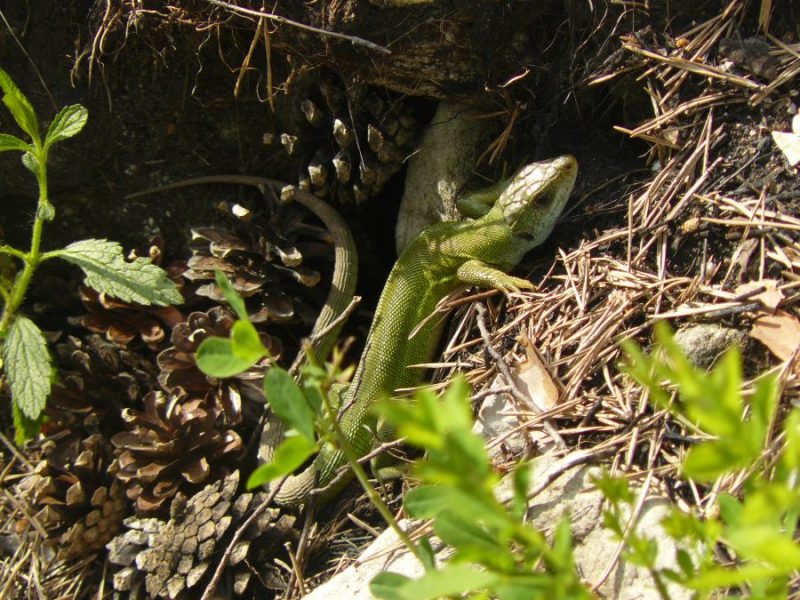 con sorpresa troviamo anche qui, come l’anno scorso in Valle del Mis, diversi ramarri verde smeraldo: riesco a fotografare due esemplari giovani, il più vecchio, grosso e scafato ci sfugge in un lampo verde.