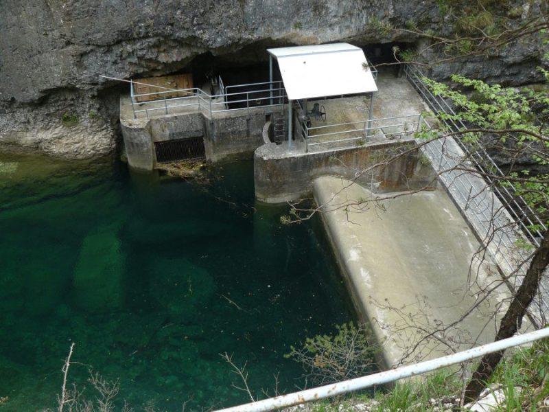 Arriviamo ora ad un altro bivio un parapetto esile di ferro ci incuriosisce e non stanchi dei mille metri già percorsi fin qui decidiamo di intraprendere il nuovo sentiero che ci si presenta, scendiamo su una cengia che si affaccia su un corso di acqua che scende dalla Val Polidoro e arriviamo ad uno sbarramento dell’ENEL, una piccola diga in cemento, su un torrente stupendo e fragile con pareti a picco.