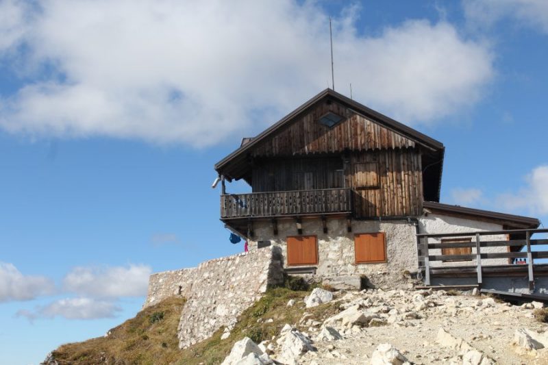 Attraversiamo la breve cengia che ci porta al canale dove una scala in ferro di 5 gradini ci aiuta a superare un leggero strapiombo, poi un cordino ci guida su per il canalone che si sale con facilità. Arriviamo sull’altopiano lunare che si stende tra Ra Gusela e il Nuvolau, lo attraversiamo seguendo i zig zag del sentiero che evita buche e inghiottitoi poi pieghiamo decisamente a destra fino a portarci sotto il Nuvolau. Qui incomincia un altro tratto attrezzato che sembra portarci in cielo, ma poi piega sotto le rocce e salendo un’altra scala, breve, arriviamo al Rifugio Nuvolau.
