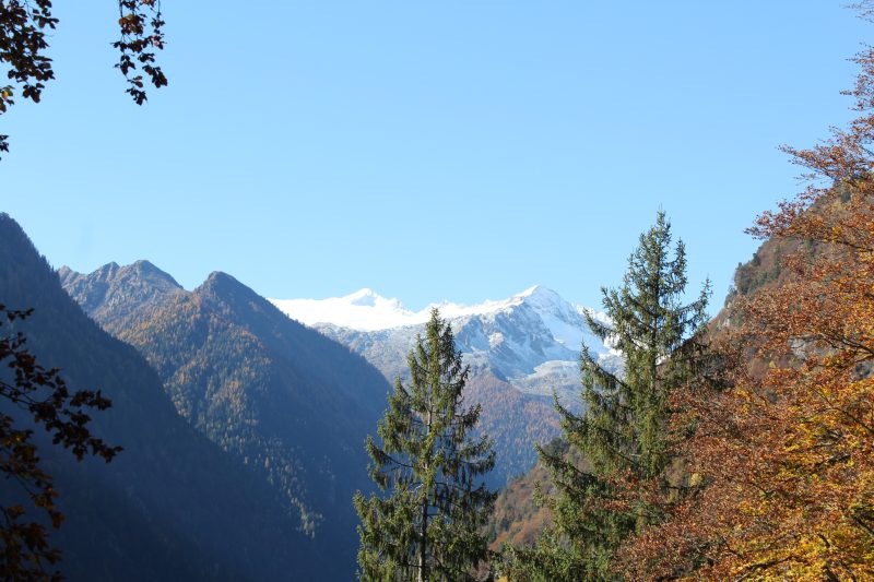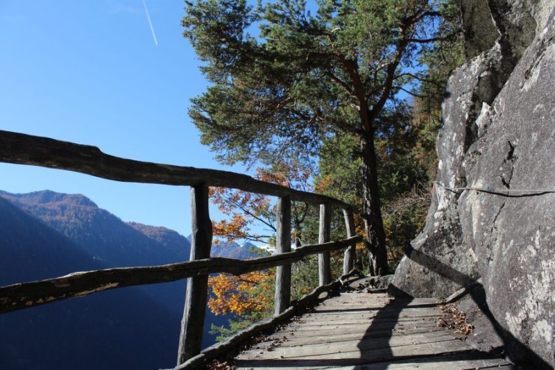 la partenza è nei pressi della Prisa, caratteristico e conosciuto locale all’imbocco della Val Genova, poco prima lasciamo l’auto in un comodo parcheggio, un cartello ci indica la partenza del sentiero che si inerpica immediatamente su per il bosco di antichi Castagni, Abeti, Faggi fino ad un bivio, poi il sentiero accenna a diminuire di pendenza fino a raggiungere un rio e torna ad inerpicarsi.