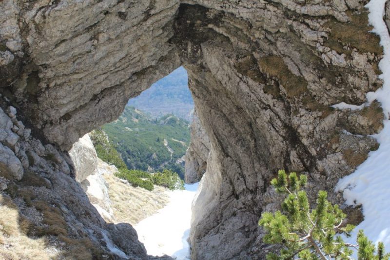 Successivamente passo accanto a una grande grotta naturale e con un altro breve tratto attrezzato giungo al punto panoramico e al Canalone Battisti, 30 minuti. Da questo punto il sentiero diventa molto più ampio, ma non perde assolutamente in panoramicità (l’altra parte del sentiero ve lo racconto alla fine). Qui inizia la ferrata, si parte in discesa all’interno del canalone Battisti, mi calo per alcuni gradoni attrezzati e poi, aggirando la parete su una cengia che si sviluppa su livelli diversi, raggiungo sempre in discesa alcune facili roccette; la ferrata si riduce ora a semplice sentiero, sempre attrezzato, in corrispondenza del tratto denominato “Antro delle Pegore” e “Grotta del Mistero”, io continuo passando sotto un arco di roccia e scendendo ancora altre roccette, percorro una breve cengia semi erbosa e arrivo all’attacco di un traverso denominato “Traversata degli Angeli” che in forte esposizione aggira lo spigolo, opportunamente attrezzato con una serie di staffe, anche se questo breve tratto richiede una leggera trazione sulla braccia in quanto un po’ strapiombante, sotto ci sono 600 m di parete e di vuoto.