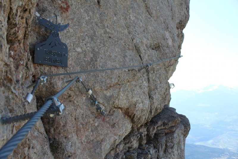 Il Sentiero delle Aquile che mi porterà all’attacco della ferrata inizia proprio dall’arrivo della seggiovia della Cima Paganella. Seguo la segnaletica “Sentiero delle Aquile” e dopo pochi minuti vengo catapultato in un mondo sorprendente, questo primo tratto richiede attenzione e prudenza, il sentiero si snoda sopra un vuoto emozionante, ma in aiuto trovo un solido e sicuro cavo d’acciaio. Scendendo lungo il sentiero tra i mughi e gli strapiombi in alcuni tratti manca il cordino, mi pare proprio dove il vuoto e più forte.