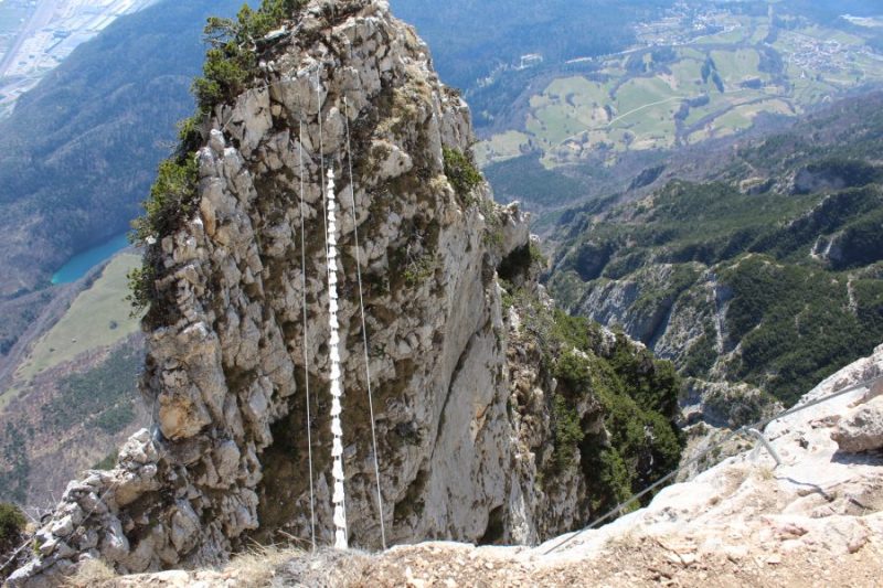 In uscita da questa traversata scendo lungo alcuni metri verticali ma con roccia ben appigliata, noto anche la presenza di una staffa, raggiungo una comoda cengia dove è possibile eventualmente sostare prima di iniziare una nuova discesa stavolta un po’ più lunga ed ostica della precedente, tuttavia non difficile e persino troppo facilitata dall’ abbondanza di staffe artificiali.” La Ferrata scende ancora, in breve raggiungo un’altra serie di staffe che conducono nei pressi di un piccolo pulpito dal quale la discesa riprende tramite altre staffe che permettono di superare una placchetta levigata ed esposta. Dopo quest’ultima discesa verticale continuo in breve traversata portandomi alla “Conca d’Oro”, zona di roccia dal colore giallastro, da qui comincia una lunga traversata che aggira la parete alternando tratti di comoda cengia ad altri invece particolarmente esposti. Inizio la traversata con un’esposizione ancora contenuta su fondo misto terriccio, poi mi calo leggermente trovando una piccola cengia, altro tratto esposto, aggiro uno spigolo trovando una lunga cengia con roccia piuttosto frastagliata e buoni appoggi, arrivo in corrispondenza della targa metallica “Cengia Terlago”. La traversata prosegue ancora per alcuni metri, qualche passaggio piuttosto esposto ma senza particolari difficoltà, mentre più in basso continuano a far da cornice la Valle dei Laghi e la Val d’Adige. La vista spazia dal lago di Garda, più lontano, ai Laghi di Toblino e ai più vicini Laghi di Lamar. Eccomi ora al primo dei due ponti sospesi.