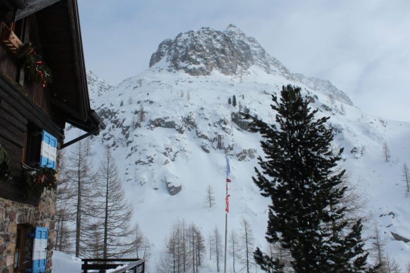 Loro proseguono per il parcheggio di Palù del Fersina, circa m. 1500 s.l.m. molto grande e a pagamento (non d’inverno, scopriremo poi) noi coraggiosamente indossiamo le ciaspe e dopo alcuni tornanti in leggera salita ci ricongiungiamo col gruppo. Ci incamminiamo in salita nel bosco per il sentiero n 343, ben innevato con neve fresca e candida e raggiungiamo con un po’ di fatica e qualche scivolone nei tratti più ripidi e ghiacciati la località Baite Laner a 1752 metri. I masi sono ben costruiti, certamente vengono ancora usati d’estate, noi li superiamo e saliamo ancora fino alla Croce di Laner m. 1860, poi finalmente andiamo più speditamente in falsopiano fino al bel rifugio Sette Selle m. 2014 s.l.m. dichiarati dall’insegna sulla parete, m. 1978 segnati su cartina Tabacco.