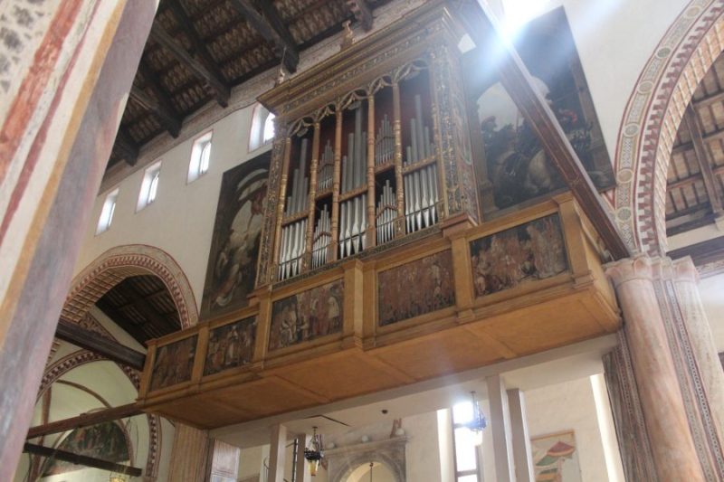 La visita alla città: il 21 aprile iniziamo con calma dopo colazione. Iniziamo la visita alla cittadina, che è ricca di un patrimonio storico ed artistico incredibile. L’impianto urbanistico con i vicoli e le strade porticate è ancora medioevale, i bellissimi palazzi affrescati e le magnifiche opere delle Chiese ci trasportano dal Medioevo al Rinascimento. Con il solito tour de force, mitigato stavolta da una sosta alla Trattoria Al Bachero con un sorprendente menù di baccalà e molto altro (ottimi piatti, ottimo prezzo!) giriamo quanto più ci è possibile. Per primo ci accoglie il Duomo di Santa Maria Maggiore, sec. XIII, costruito per volere del signore Walterpoldo demolendo una borgata.