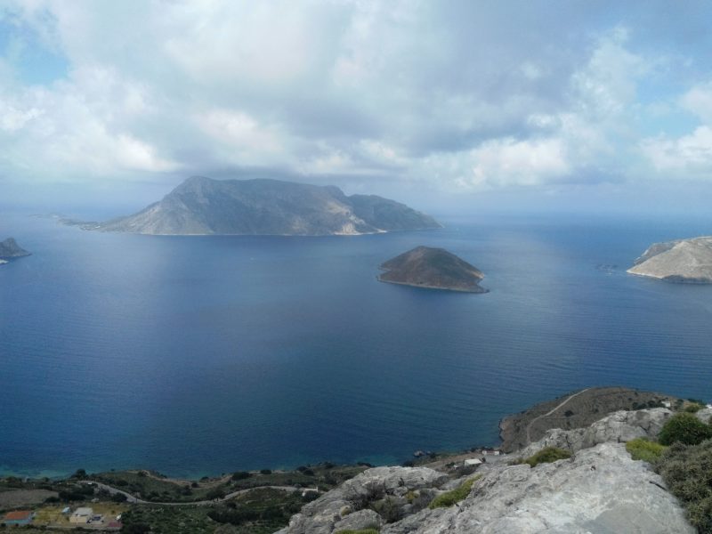 Il cielo della notte è nero e nel nero si vedono le stelle come in un dipinto. La gente del posto è abituata a vedere alpinisti o climber che girano per l’isola ed è sempre ospitale, disponibile e simpatica. Noi siamo stati avvantaggiati dall’avere con noi Thomas, nativo della Macedonia, che parla perfettamente il greco e ha potuto ricevere consigli su dove andare a mangiare, ma le persone sono molto cordiali e disposte ad aiutare e alcuni parlano un po’ di italiano, oltre all’inglese. Le locande (non siamo riusciti a provarle tutte ma molte sì) offrono menù favolosi di pesce fresco, per non parlare della carne di agnello, capretto o coniglio, una prelibatezza da leccarsi i baffi per giorni e giorni. Non mancano le verdure, pomodori, cetrioli, melanzane del posto, tante verdure ripiene o condite con salse greche e infine frutta e dolci. Per mangiare e bere abbiamo speso pochissimo. Una sera siamo andati a mangiare sull’isoletta davanti al piccolo porto di Kalymnos: una barca ci ha portati al di là del breve tratto di mare che separa le due isole, ci avevano suggerito l’ultimo ristorante sulla riva e la scelta è stata ottima: grigliate di pesce freschissimo, verdure, frutta, dolci e caffè, decine di gatti buongustai sotto i tavoli, una serata magnifica e alla fine ritorno di notte in barca. Grazie agli scooter abbiamo potuto girare in una giornata tutta l’isola, passare le alture e scendere verso spiagge, calle e porticcioli, visitare il capoluogo e un bellissimo monastero posto in cima ad una collina, con un magnifico panorama sulla cittadina e il mare.