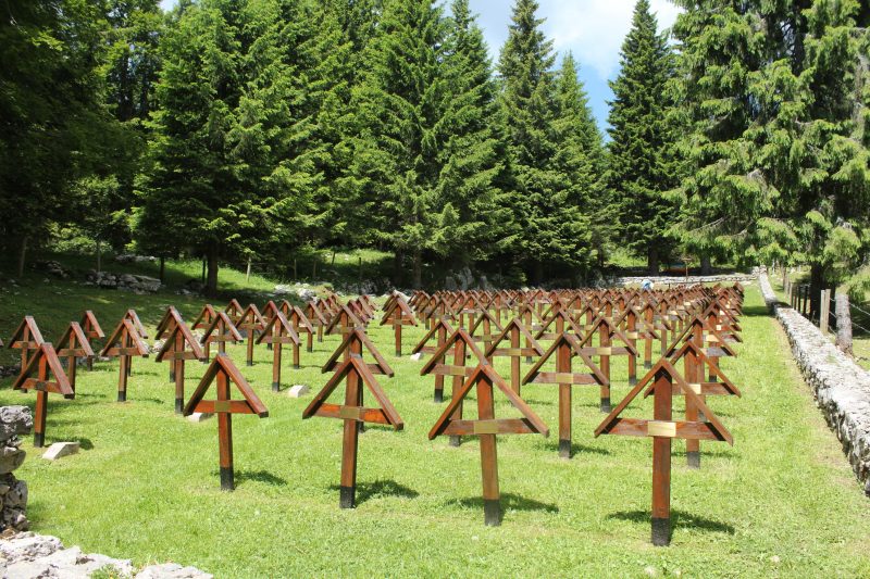 La strada si snoda nel bosco in leggera salita, raggiungiamo una costruzione diroccata, costruita dagli austriaci durante l’occupazione a q. 1402 m.s.l.m e proseguiamo sulla strada principale ignorando le altre stradine che si diramano ai lati e si perdono nel bosco. Stiamo risalendo senza fatica i piedi del monte Mòsciagh, che non saliremo per questa volta. Seguiamo la strada e in poco tempo arriviamo in una valletta verde e soleggiata. Da lontano scorgiamo un monumento in mezzo al prato: è dedicato alla Brigata Catanzaro, ci avviciniamo tra le erbe alte e leggiamo la scritta: “La baionetta ricuperò il cannone” e pensiamo a quanti cruenti combattimenti all’arma bianca devono essere avvenuti in questi luoghi ora così tranquilli. Poi ritorniamo sulla forestale e in breve arriviamo a un basso muro con un cancello, le bandiere austriaca e italiana sventolano insieme ricordandoci che in questi luoghi combatterono e morirono soldati appartenenti a due eserciti nemici accomunati dalla stessa sorte. Entriamo nel Cimitero Militare N° 1, le lapidi in pietra sono sparse nel prato, alcune riportano nomi e gradi dei soldati caduti ma molte sono le sepolture senza nome. Proseguiamo per un vialetto erboso fino al secondo Cimitero: le semplici croci, tutte uguali, sono allineate come se fosse un battaglione pronto a partire…anche qui molte riportano i nomi dei caduti, ma molte sono anche quelle d’ignoti. In questi due cimiteri vennero sepolti 1142 soldati austro-ungarici e i luoghi sono stati restaurati circa una ventina di anni fa con la collaborazione di varie Associazioni ed Enti sia italiani che austriaci. Le salme sono state traslate, come per tutti i cimiteri di guerra, nei vari Sacrari e Ossari, qui resta la testimonianza di tutte queste vite perdute sperando che ciò che resta ci porti a riflettere e non ci faccia ripetere gli stessi orrori.