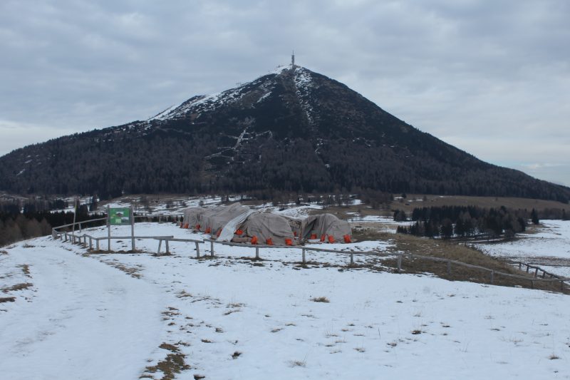 Questo luogo presenta spunti naturalistici e storici interessanti, le numerose torbiere, i resti archeologici del “Castelletto Mandruzziano”, la sorgente Wolchenstein e molto altro, alcuni cartelloni illustrano storia e curiosità del luogo. Giunti in piano voltiamo verso sinistra, in direzione della provinciale che raggiungiamo percorrendo una forestale parallela, in mezzo ai boschi di abeti, che ci porta fino al km. 21,200 circa. Da questo punto continuiamo sullo stradone per altri 600 metri fino a raggiungere l’auto. Pensiamo valga la pena di dare un’occhiata alla piana e alle ex-caserme poco lontane, sulla provinciale verso Garniga. Molti edifici sono stati ben ristrutturati e alcuni locali sono adibiti a uffici, resta in macerie una parte del grande complesso di caserme, il posto è molto bello in mezzo a distese prative. Ritorniamo indietro e prima di tornare verso Trento ci fermiamo alla Capanna Viote per un ottimo dolce e una cioccolata calda. Siamo contenti, un bel giro panoramico, facile e adatto a questa giornata invernale che ha alternato un cielo nuvoloso e un debole sole a intensi e inattesi sprazzi di azzurro.