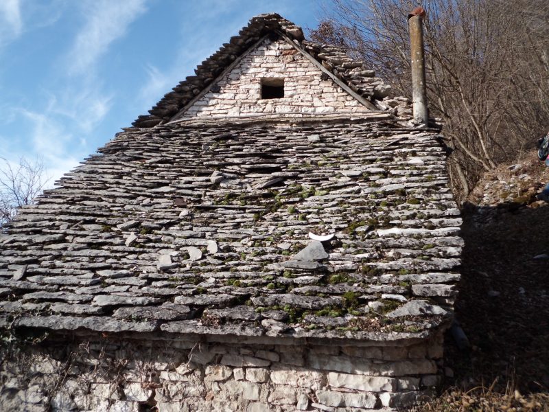 Continuiamo a salire nel bosco dietro al nostro guru, i sentieri che collegano le varie casere sparse ai fianchi del Terne, un tempo abitate da famiglie numerose, costituiscono un dedalo in cui è facile perdere la giusta direzione, ma noi riponiamo la massima fiducia nel nostro capo branco. La giornata è meravigliosa, il cielo è azzurro intenso e non fa nemmeno granché freddo, il tempo ideale per girovagare in buona compagnia. In mezzo al bosco, alla nostra destra, notiamo diversi terrazzamenti fatti di muretti a secco, in alto s’intravede un’altra casera. Penso ai racconti sentiti dagli anziani: raccontavano della fatica fatta per vivere in questi luoghi e sopravvivere al lungo inverno. Erigere i muretti, portare su con le gerle la terra buona (quella del monte era scarsa e magra) seminare segale, orzo, patate e sperare nella clemenza del tempo, falciare il fieno fino alla sommità del monte, portarlo giù e conservarlo, badare alle bestie, mungerle, fare latte e burro. E non era finita. Bisognava anche approvvigionarsi di acqua, che non sempre era a portata di mano, spesso il compito di scendere fino a valle, dove c’erano i torrenti, era dato ai bambini che aiutavano anche in mille altri modi. E le donne? Che vita dovevano fare solo per lavare i panni, cucinare in stanzette buie e senza camino (il fumo usciva dalla finestra, non senza affumicare pareti e persone) e accudire bestie e familiari.