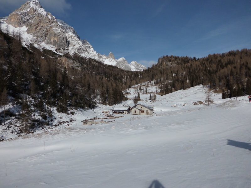 Il terreno è ricoperto di neve, non molto alta per la verità, decidiamo di lasciare in auto le ciaspe e portare solo i ramponcini per scrupolo. Imbocchiamo la stradina asfaltata in prossimità di un Agriturismo (segnavia 557) e saliamo lungo la sinistra orografica del torrente della Grava, sulle pareti rocciose dall’altro lato della valle vediamo una bellissima cascata di ghiaccio e io mi ricordo di esserci arrivata da ragazza, passando dietro al salto d’acqua. Fa abbastanza freddo, il sole tocca solo le cime della Moiazza che ci sovrasta alla nostra sinistra e a volte il vento, che in quota spazza le vette, ci colpisce sollevando e gettandoci in faccia spruzzate di neve. La nostra fila si snoda rumorosa e colorata lungo la strada bianca in mezzo ai boschi di abete, larice e faggio, anche qui purtroppo vediamo numerosi schianti dovuti alla bufera di fine ottobre. Camminiamo senza molto sforzo per circa 4 chilometri fino a raggiungere dopo circa un’ora la conca in cui sorge la Casera della Grava a 1627 m.s.l.m.
