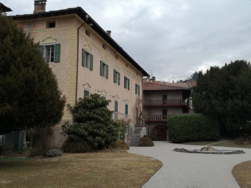 E’ domenica e passano poche auto, altre persone oltre a noi passeggiano a piedi. La strada è stretta e si snoda all’inizio in cengia su una forra sul cui fondo scorre il Rù di Carpine, poi ne esce girando verso destra e prosegue sempre in piano per bei prati fino al paese di Meano. Camminiamo per la parte vecchia del paese tra le caratteristiche case con poggioli e scalette in legno e facciamo una breve visita al parco della Villa Salvadori – Zanatta, aperto al pubblico.