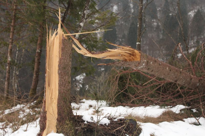 Riprendiamo la descrizione, sorpassiamo l’Agriturismo Orsera, ora chiuso (buona cucina, ampio parcheggio, anche per camper) e “Lasciamo la stretta strada “principale” voltiamo a sinistra salendo lungo la stradina asfaltata con indicazioni per Fraina. Raggiunto il bel pianoro con alcune case e casere di Fraina Bassa, m.663 s.l.m. l’asfalto finisce e lasciamo l’auto in un esiguo spazio a bordo strada. “ Vediamo che una casa è abitata anche d’inverno, le altre sono chiuse o abbandonate”. Anche oggi, come un anno fa, il tempo è incerto, ma siamo fiduciosi: indossiamo gli scarponi e ci avviamo lungo la stradina a tratti insidiosa per il ghiaccio. Al primo bivio trascuriamo l’indicazione a sinistra “sentiero 819 Forcella San Mauro” e proseguiamo a destra (strada privata) salendo comodamente fino alle poche case disabitate (tranne una) di Fraina Alta m. 713 s.l.m. e qui ci colpisce la visione dell’immenso pianoro che, invaso da abeti cresciuti negli anni di abbandono dei prati, ci presenta ora la devastazione del cataclisma di ottobre 2018.