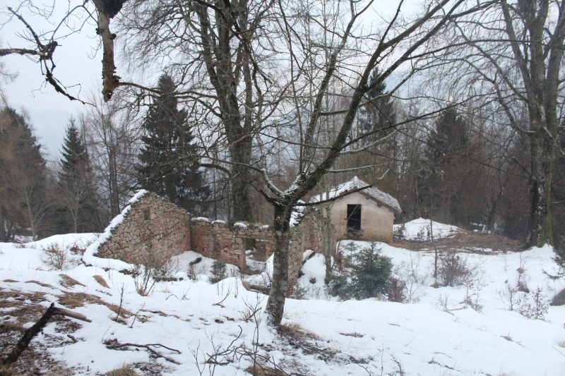 Alla fine arriviamo a incrociare il sentiero 819 che scende da Forcella San Mauro, lungo il corso di un torrente, e lo seguiamo in direzione Fraina.” In basso ritroviamo la neve e poi il ghiaccio e “Raggiungiamo uno slargo con la partenza di due teleferiche e poi un primo bivio, proseguiamo diritti in direzione Fraina, nel bosco ci attira la presenza di una “Calchera” una fornace per produrre la calce, ce ne sono molte in Val Canzoi. Presto superiamo l’ultimo bivio il primo trovato in andata ritornando così nella piana di Fraina Bassa”. Alla fine della passeggiata, ci accordiamo per una sosta nel primo bar a portata di mano, per una buona birra, purtroppo non scegliamo l’osteria di Toschian della volta precedente ma un altro esercizio, la birra non è fredda al punto giusto e l’accoglienza non delle migliori: mai lasciare il bar vecchio per il nuovo! Ci lasciamo con il proposito di ritrovarci martedì 12 per un altro giretto, ma questo ve lo racconteremo se ci seguite nel prossimo racconto…