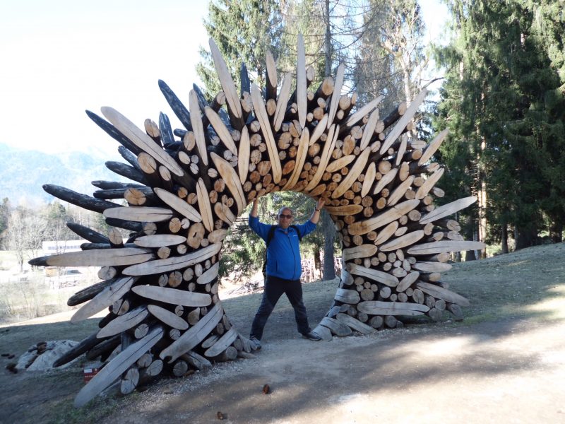 Superiamo l’Hotel Legno e arrivati al parcheggio che si trova qualche centinaio di metri dopo, vediamo che purtroppo il percorso “Arte Natura” è chiuso perché interamente distrutto, azzerato il lavoro di tantissimi anni. Non sono noti i tempi per il ripristino. Ci dispiace perché era un lungo percorso libero in mezzo al bosco in cui scoprire le opere disseminate tra gli alberi. Anche il giardino di Villa Strobel, una villa storica del 1861 dove l’avventura del progetto di “arte nella natura” cominciò nel 1986 grazie a un gruppo di amici, è temporaneamente chiuso. Era stato riaperto insieme con la villa, anch’essa ristrutturata, solo pochi anni fa in occasione del 30^ anniversario della fondazione, ma già dal prossimo maggio ritornerà agibile.