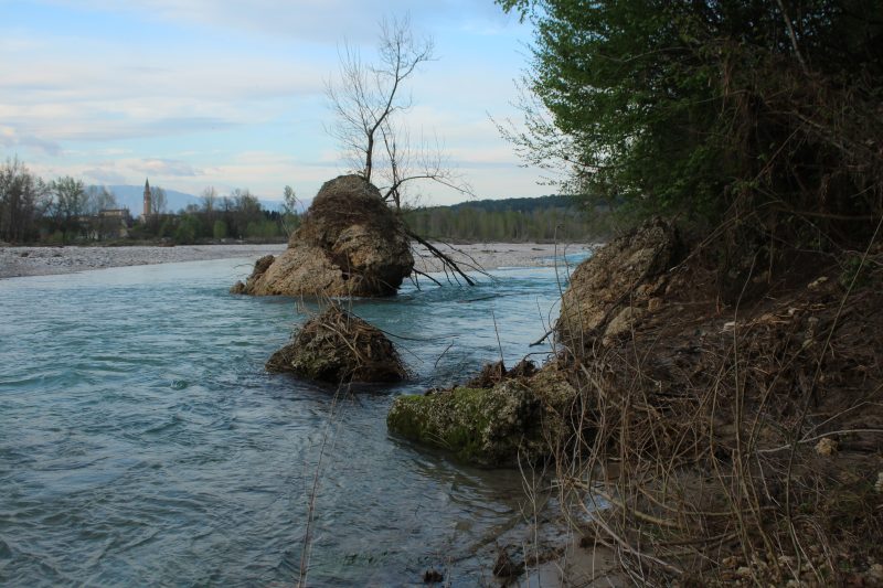 Noi, dopo aver reso un silenzioso omaggio al Fiume sacro alla Patria, prendiamo a sinistra risalendone il corso. Veramente dovremmo tornare al camper, non abbiamo scarpe e vestiti adatti a un’escursione che si annuncia fangosa, ma se dessimo solo un’occhiata fino al primo bunker? Seguiamo le segnalazioni e poi un bunker attira l’altro, come le ciliegie. Il primo è una postazione di vedetta, il seguente una postazione di mitragliatrice, scavata all’interno di una roccia. Proseguiamo sul sentiero che gira in mezzo al bosco, scende sul greto del fiume, risale le sponde tra gli alberi visitando i vari bunker. Arrivati all’altezza del paese di Falzè, sull’altra sponda del Piave, troviamo un grande masso, siamo alla Croda degli Zatteri. All’epoca della Repubblica di Venezia, questo masso segnava agli zattieri bellunesi il porto di Falzè, forse dove ora esiste un parco fluviale. Il percorso è movimentato, saliamo alcune scalette, entriamo nelle caverne scavate nella roccia, una specie di “Occhio del gigante” che sorvegliava il corso del Piave simile alle postazioni di vedetta scavate sulle Dolomiti. Arriviamo su una sponda rocciosa del Coston, seguiamo i gradini scavati nella roccia e arriviamo a una postazione in cemento e poi al Tavaràn Grando, una grande grotta carsica che era frequentata fin dal Paleolitico. E’ curiosa l’origine del nome, “tavaràn” in veneziano indica un gonfiore e “tavàre” sono le zanzare: in effetti qui ci sono due sorgenti che quando sono in piena riempiono la grotta. Entrati nel grande androne, vediamo altri due ingressi dove scorrono i ruscelli e diversi cunicoli, ma non ci fidiamo a visitare l’interno la grotta che si sviluppa per più di cento di metri per cunicoli, laghi sotterranei e marmitte fino ad una sala di crollo che blocca la prosecuzione. Visitandola con una guida e con l’attrezzatura adeguata si può aggirare la frana attraverso cunicoli secondari e arrivare a piccole caverne con concrezioni.