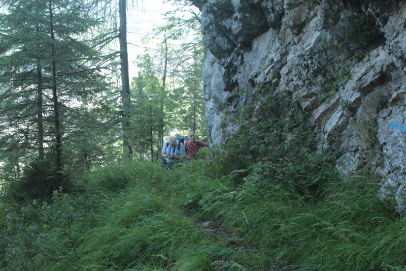 Saliamo per la mulattiera militare sentiero 736 che porta alle Vederne, a quota 700 metri tralasciamo la mulattiera principale e imbocchiamo il sentiero a destra, segnato dai cartelli ” Croce degli Alpini- Stoli Morosna”. Raggiungiamo il bivio seguente, tralasciamo, a sinistra, la ripida traccia che porta alla Croce degli Alpini (discesa faticosamente nel giugno scorso) e continuiamo sulla bella mulattiera che corre a lungo in cengia offrendo bellissimi scorci sulla profonda Valle del Primiero e le superbe Pale di San Martino. A quota 900 m.s.l.m troviamo un incisione nella roccia. Ci chiediamo a cosa si riferisce… (C D I 1904) continuiamo e giungiamo ad un bivio. Sarebbe bello andare avanti così, ma a quota 1020 circa improvvisamente il sentiero finisce, interrompendosi su un costone franoso: il percorso continua su una ripida traccia che sale nel bosco.