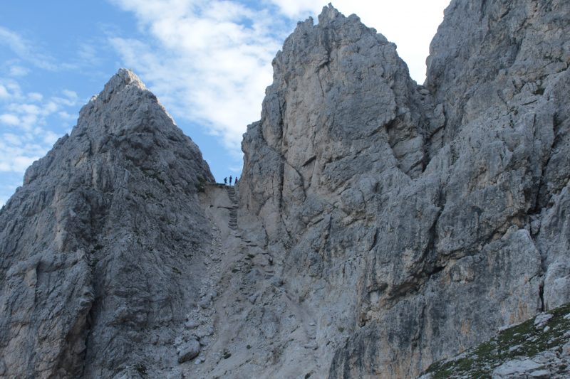 Il cordino di acciaio ci aiuta a superare il tratto di canalone ripido e scalinato giungendo senza problemi in “Forcella de Misurina” 2395 m.s.l.m., la prima, stupenda e panoramica sella che incontreremo nel nostro percorso. Affrontiamo la discesa successiva, sempre aiutati dal cavo di acciaio scendiamo il tratto abbastanza ripido e con alcuni passaggi discretamente esposti. Il sentiero passa attraverso una finestra naturale e con altro passaggio esposto, ma protetto e facile, raggiungiamo il fondo del Ciadin della Neve, 2175 m.s.l.m. Purtroppo dell’antico ghiacciaio restano poche lingue di neve, destinate a sparire del tutto. Qui arriva anche il sentiero 118 che parte da Misurina e porta diritto al Rifugio Città di Carpi attraverso la Forcella de la Neve, noi proseguiamo invece verso sinistra (cartelli) in ripida salita verso la Forcella del Diavolo, 2380 m.s.l.m. salendo il tratto iniziale roccioso grazie ad alcune scalette metalliche e poi “in libera” un tratto detritico in cui bisogna fare attenzione a non far cadere i sassi sulle persone sottostanti***.