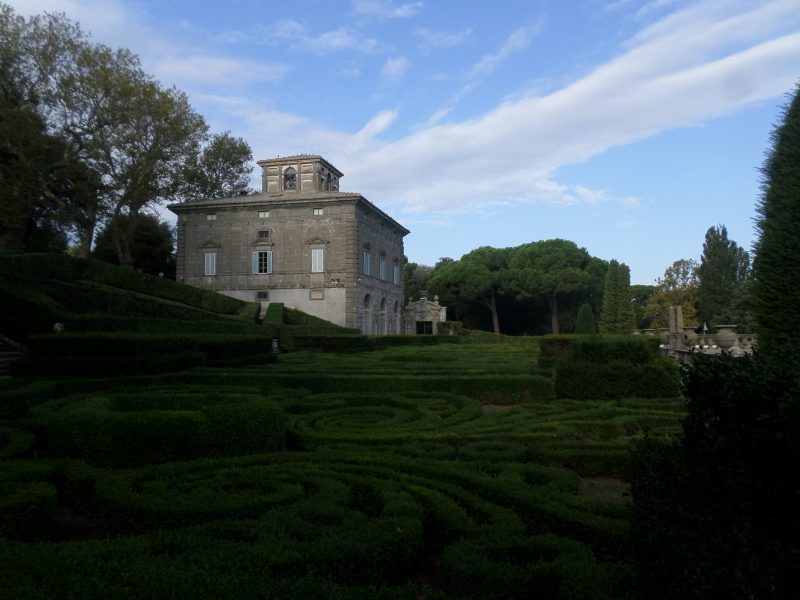 Ci aggiriamo nel labirinto di basse siepi che circondano la Fontana del Quadrato o Dei Mori, un magnifico bacino suddiviso in quattro vasche, in ognuna “galleggia” una barca con un putto che getta acqua, al centro un triplice cerchio di vasche che culminano col gruppo di quattro Mori che reggono lo stemma di Papa Sisto V (quello che non la perdonava neanche a Cristo). Questo è il primo dei tre giardini che vedremo, costruiti a terrazzamenti sul declivio di una collina, già proprietà di caccia del Cardinale Gambara. I giardini sono la maggiore attrazione di Villa Lante, un ruscello li attraversa longitudinalmente con giochi d’acqua, cascate, fontane e grotte sgocciolanti, oggi con meno acqua che in passato, ma ugualmente belli. Questo armonico flusso d’acqua infatti non è proprio come è stato ideato dallo specialista di architettura idraulica da Siena, Tommaso Ghinucci, ma conserva l’impronta e il fascino del suo genio. Saliamo la scalinata che separa le due ville ed eccoci alla Fontana dei Lumini, una vasca in cui l’acqua zampilla da settanta lucerne e fuoriesce nella Fontana della Tavola (o Mensa del Cardinale). Il ruscello che alimenta entrambe scende dalla Fontana della Catena, una lunga, elegante cordonata con al termine un grande gambero dalle cui chele sgorga l’acqua che prima si getta nella Fontana dei Giganti, le statue che rappresentano il Tevere e l’Arno (e si riferiscono all’alleanza tra papato e Medici di Firenze). Arriviamo alla Fontana dei Delfini e infine al giardino superiore, con la Fontana del Diluvio, dove l’acqua scende (un tempo sgorgava copiosa) dalle rocce simboleggiando la natura selvaggia che poi l’uomo piega al suo volere. In effetti, abbiamo fatto il percorso inverso da quello ideato, pensato per cominciare dall’alto e scendere verso il basso, dal disordine del diluvio tumultuoso alla simmetria geometrica del labirinto dei Mori: all’inizio c’è il caos, la creazione, la natura selvaggia, via via l’armonia creata dall’uomo, la simbiosi con la natura, l’ordine delle cose. Ammiriamo anche le Logge affrescate, le Grotte, gli alberi giganteschi, le statue, i mascheroni, gli emblemi dei proprietari che si sono susseguiti nel tempo: gamberi, sfere, stelle, api, aquile e leoni, tutti simboli di potere e nobiltà delle Famiglie Farnese, Este e Gambara.