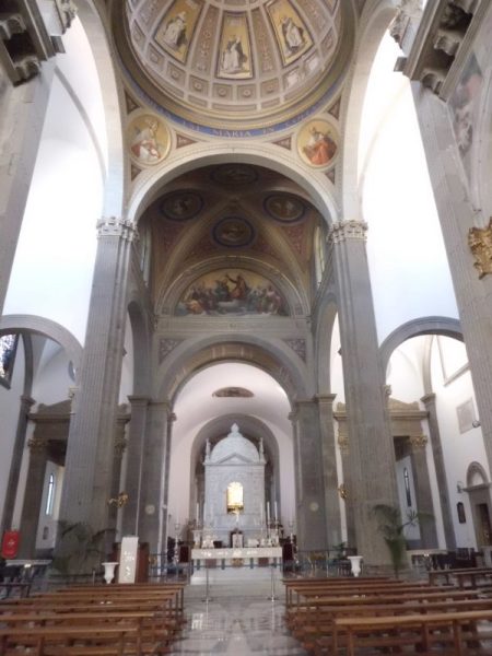 A Civitavecchia prendiamo un tratto di autostrada e raggiungiamo La Quercia, una frazione a circa tre chilometri da Viterbo, il cui borgo sorge tutt’attorno al Santuario dedicato alla Madonna. Il paese è piccolo ma ben curato, la piazza è dominata dalla facciata monumentale della Basilica, considerata uno dei più armoniosi edifici rinascimentali del Viterbese. Parcheggiamo il camper in uno spiazzo lungo la strada e visitiamo la Chiesa a cui il borgo deve il nome. La storia si mescola alla leggenda: nel 1417 a un pittore venne chiesto di dipingere l’immagine della Madonna col Bambino su una tegola, il manufatto fu poi appeso a una quercia, a protezione della proprietà del committente ed esposta alla venerazione dei poveri contadini che faticavano in quelle terre e lì venerata per decenni. Inutili furono i tentativi di portare il dipinto in altro luogo, la Madonna tornava sulla sua quercia! La devozione e i miracoli crescevano finché la pianta con la tegola fu prima inglobata in una capanna e poi nel complesso monastico della chiesa di Santa Maria della Quercia, i cui lavori iniziarono nel 1470, dopo che, per intercessione della Madonna, la popolazione viterbese fu salvata dalla peste del 1467. Entriamo nel Santuario dopo aver ammirato le lunette della facciata, opera di Andrea Della Robbia, al centro è raffigurata la Madonna della Quercia, ai lati i Santi Pietro e Tommaso d’Aquino. All’interno stiamo col naso in su per guardare il soffitto a cassettoni, ricoperto in oro, progettato da Antonio da Sangallo e poi guardiamo le altre opere, gli affreschi e i dipinti dei numerosi artisti susseguitesi nel tempo. Ci avviciniamo al tempietto in marmo che custodisce la tegola miracolosa, una semplice tegola di tetto con una tenera immagine di Donna col suo Bambino. Ai lati di questo ci sono gli affreschi del Ghirlandaio.