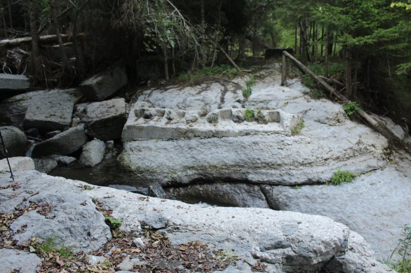 Giungiamo a Pont, m. 1149 s.l.m., e appena dopo alcune casere abbandonate, ci appare la devastazione completa, il letto del torrente ha invaso i prati, i boschi e la strada, letteralmente scomparsi sotto massi e tronchi. Non c’è traccia del ponte, tutt’attorno il terreno è stato arato dall’acqua e dal vento, rimescolato e rimodellato. Riconosciamo la potenza della natura, degli elementi acqua, fuoco e vento, ne abbiamo bisogno, ma ci sovrastano e ne dobbiamo avere timore, oggi come nei tempi remoti. Passiamo il torrente e ci avviciniamo alle cascate, con prudenza ci affacciamo sul vertiginoso salto d’acqua che ha scavato e levigato con la sua forza le rocce da cui precipita. Anche qui il ponticello è stato spazzato via, con qualche difficoltà saliamo sulla riva opposta e imbocchiamo un vecchio sentiero che passa tra i massi, squadrati e abbandonati, di una cava dismessa e raggiungiamo un vecchio Tabià (fienile) diroccato. Ricordiamo, che il sentiero proseguiva verso una cascata superiore, ma vegetazione e rovi hanno invaso tutto e la traccia si perde nel bosco, torniamo indietro. C’è un altro angolo che ci ricordiamo verde e magico e ci precipitiamo, Vogliamo vedere se almeno questo piccolo posto magico si è salvato…prendiamo un sentiero e giungiamo con qualche apprensione in questo angolino di mondo.