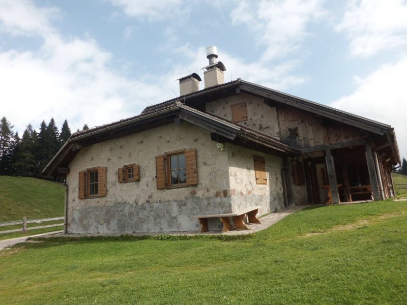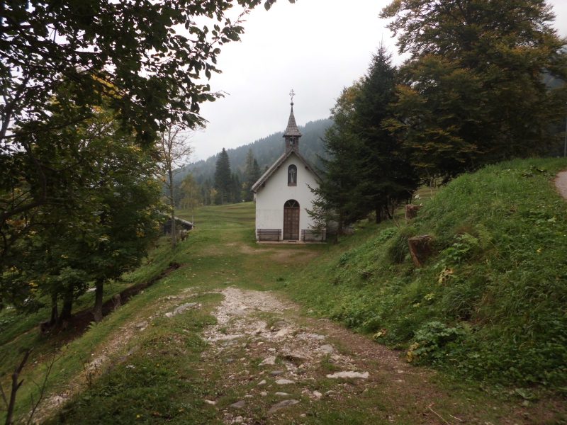 Imbocchiamo la stradina asfaltata, come prima cosa passiamo dalla Chiesetta dedicata a Sant’Antonio da Padova che spicca bianca, col suo piccolo campanile, contornata dal verde dei prati e degli abeti; non è un edificio antico, fu costruita nel 1913 per permettere agli abitanti delle malghe di partecipare alla messa, durante la I Guerra fu però usata come magazzino e polveriera.