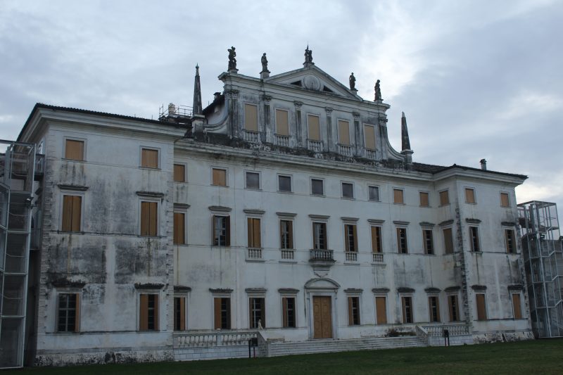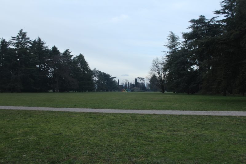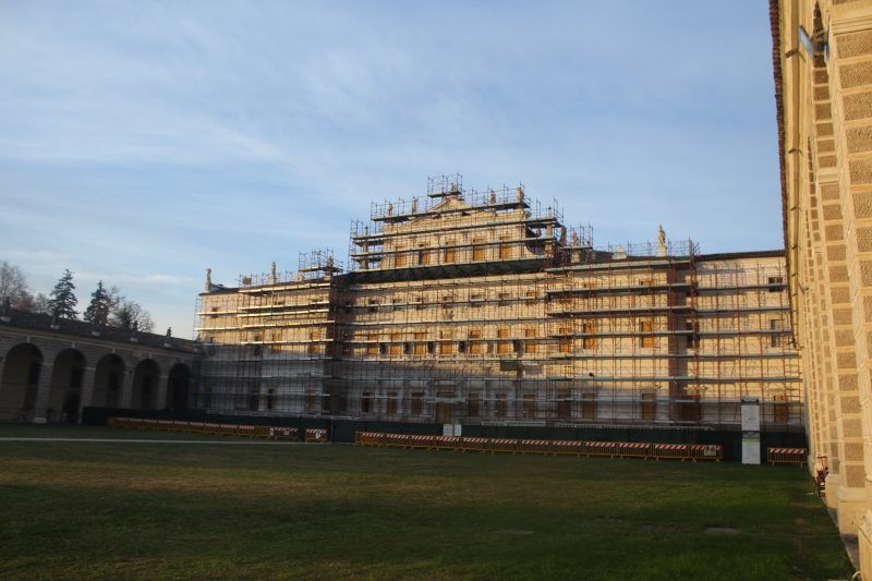 Arriviamo nel primo pomeriggio di sabato 4 gennaio, parcheggiamo nella sosta camper adiacente alla villa, siamo fuori stagione e non ci sono servizi, in cambio non si paga alcun ticket. La villa è grandiosa e armonica, spicca bianca sulla piazza prativa quadrata, chiusa ai lati dalle barchesse e delimitata da tre portali collegati da esedre. Guarda verso la successiva piazza rotonda, anch’essa a prato, circondata dai porticati che finiscono con due torri.