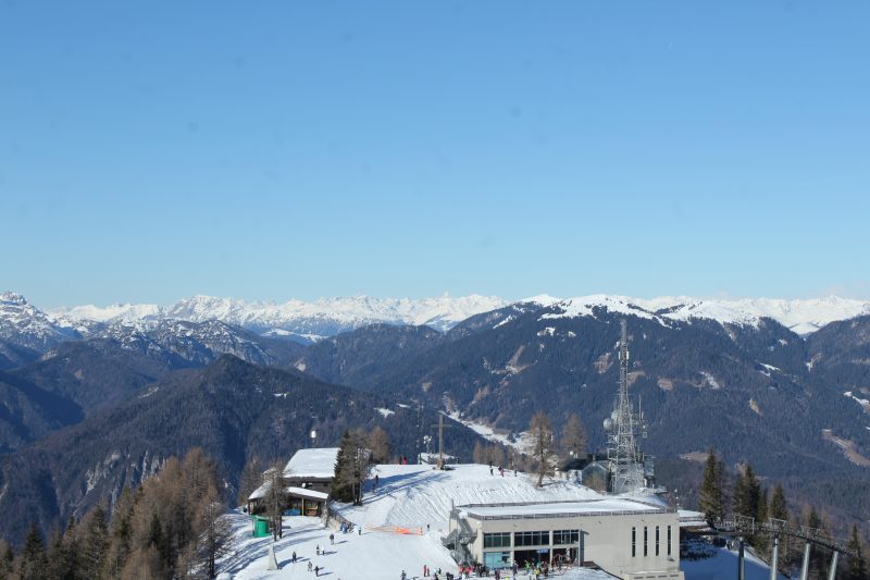 Parcheggiamo il nostro camper nel grandissimo parcheggio vicino alla Funivia, 820 m. s.l.m., gratuito, e studiamo il da farsi. Il Santuario è raggiungibile a piedi per il Sentiero del Pellegrino (segnavia CAI 613) che si snoda tra i boschi della foresta Tarvisiana, passa per Malga Lussari e raggiunge il Monte Santo in circa 2 ore e mezza con circa 970 metri di dislivello. Ci sono altri itinerari, più alpinistici, ma è tardi…per questa volta faremo i turisti comodi e seguiamo gli sciatori che sciamano a frotte verso la telecabina che parte da qui e con due tronconi supera in pochi minuti i quasi mille metri di dislivello depositandoci alla stazione a monte, 1790 metri s.l.m., dove iniziano le ampie e ripide piste da sci. La vista sul santuario non delude, è proprio “da fiaba”, un minuscolo borgo raccolto attorno alla chiesetta, appena sotto il cocuzzolo innevato del monte. Il bianco della neve è abbagliante, ci aggiriamo tra gli sciatori e i pellegrini, alcuni giunti per il sentiero, i più come noi in funivia.