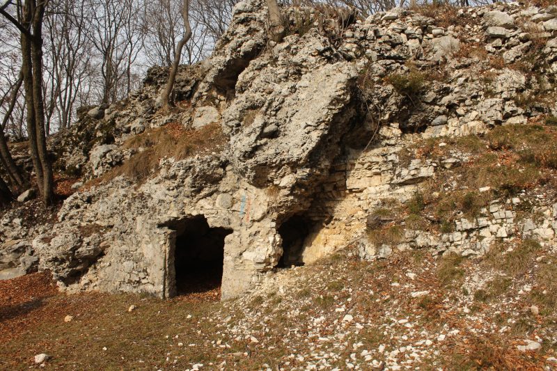 L’Eremo è all’ombra, a 834 m.s.l.m. e oggi fa piuttosto freddo, ritorniamo al prato solatio per fare la nostra veloce sosta pranzo e poi saliamo brevemente il rilievo boscoso dietro alla chiesa, anche qui entriamo in alcune caverne scavate nella roccia, lunghi corridoi, scalette di pietra, postazioni, aperture da cui sorvegliare la sottostante mulattiera. Anche nel bosco una piccola grotta è stata scavata in un roccione, ci sembra un posto di guardia. Scendiamo lungo la mulattiera che poi risale dall’altro lato della valletta boschiva, ma con meno pendenza di quella che ci ha portati all’eremo.