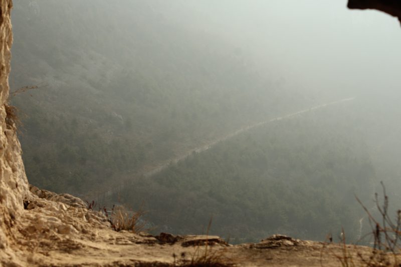 Dovremmo terminare l’anello ritornando verso la selletta vicino al torrione con i fori e proseguendo sul sentiero, ma è da lì che stamattina abbiamo visto la cengia e vogliamo trovarla. Scendiamo per traccia dagli ex baraccamenti fino a portarci sulla strada, la attraversiamo, ci inoltriamo nel bosco e ravanando in salita e in discesa tra alberi e massi, la mulattiera è franata, ci portiamo davanti alla parete. Troviamo i resti dei pioli di una scala di ferro che saliva fino allo scavo della cengia che si interrompe, sembra collassata una parte dell’opera che finisce con un camino verticale che forse una volta era attrezzato. Non consigliamo questa deviazione. Noi siamo ritornati alla strada asfaltata e scesi per la stessa raggiungendo il tornante lasciato in mattinata (quota 500 m. circa). Risaliamo il tratto ripido, raggiungiamo la selletta e continuiamo in direzione nord ovest per il sentiero 601 sullo spartiacque tra Nago e Loppio. La mulattiera a volte corre incassata nelle vecchie trincee, ora più in cresta, rasentando postazioni a picco sulla profonda valle sottostante. Tutto il percorso è caratterizzato dalla presenza dai resti di postazioni per mitragliatrice, brevi gallerie, ricoveri, tunnel, camminamenti, serbatoi per l’acqua, ruderi di pareti in cemento. Quello che più ci meraviglia tuttavia è la strada militare che stiamo percorrendo, dopo un secolo è ancora salda, costruita a regola d’arte supera con pendenza regolare le asperità del terreno e ha muri spessi e ben squadrati, fatti per durare nel tempo. Cominciamo a scendere, passiamo tra due alte pareti di roccia e troviamo a circa 500 metri altre postazioni militari, tre gallerie scavate nella roccia. Scendiamo per resti di gradini in cemento e individuiamo subito la breve traccia che porta verso l’alto, alla piazzola tra i due torrioni di roccia. Saliamo e ci troviamo tra i due “denti” su un terrazzino sull’orlo della falesia, da dove le mitragliatrici potevano controllare e spazzare i nemici in avvicinamento. Il vento soffia prepotente su questo pianerottolo nella fessura tra le due rocce, ritorniamo sul sentiero e riprendiamo la discesa, incontrando altri manufatti. La mulattiera ci consente una bellissima vista sul Lago di Garda, sui monti che lo circondano e sui paesi sparsi nella Valle del Sarca, ci abbassiamo gradatamente, raggiungiamo il primo bivio e caliamo verso destra giungendo in poco tempo al capitello e allo spiazzo dove abbiamo parcheggiato. Più che un giro ad anello il nostro percorso assomiglia a un 8, con diverse deviazioni. Noi vi suggeriamo di fare il percorso ad anello del Sentiero della Pace (segnavia 601 e frecce blu) descritto nel cartellone, salita dal parcheggio in senso orario, Segrom, Malga Zurés e discesa.
