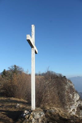 Scendiamo per una gradinata scavata nella roccia raggiungendo il livello sottostante, da qui attraverso le feritoie si vede il Monte Altissimo, dover c’erano le postazioni italiane. Risaliamo e sbuchiamo in una trincea, percorrendola troviamo caverne usate per il ricovero dei soldati o per immagazzinare munizioni e viveri. Alla fine puntiamo alla sommità del monte e alla croce bianca, che ora ci appare più vicina. Camminiamo sul dorso prativo del Monte Creino, davanti a noi si staglia contro il cielo azzurro il vicino Monte Stivo, con la vetta imbiancata, ci ricordiamo di aver letto che gli austriaci avevano costruito una teleferica che, partendo da Arco, giungeva sia qui che al Monte Stivo. Ci fermiamo un poco alla Croce, il panorama è bellissimo, il versante del Creino che dà verso il Garda e la Val di Gresta è verticale e roccioso, a picco sotto di noi c’è il Maso Naranch, tutto attorno vediamo monti a perdita d’occhio, le pendici verso il Passo di Santa Barbara invece declinano dolcemente con prati e campi coltivati.