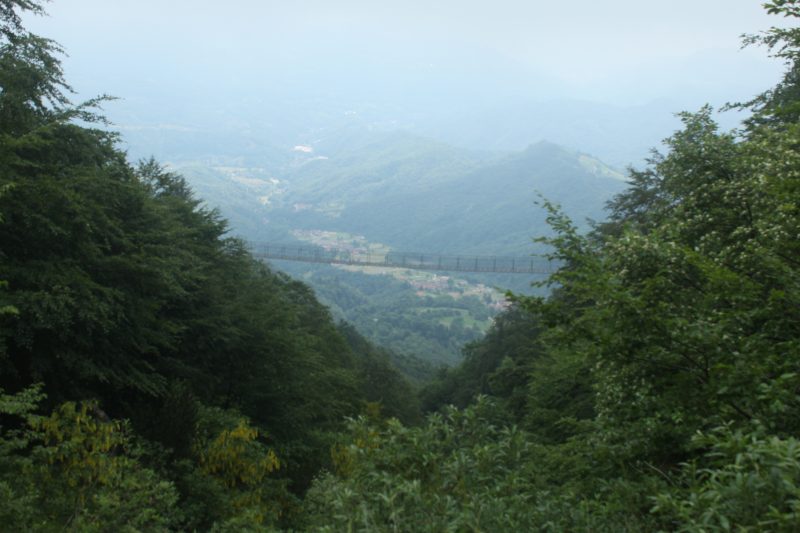 Il ponte è conosciuto impropriamente come “ponte tibetano” e attira moltissima gente, oggi però incontriamo poche altre persone, complice il tempo non proprio stabile. Meglio così, possiamo attraversare noi soli la stretta e oscillante passerella che supera il vallone, in parte colpito dalla frana che si è portata via un pezzo della strada del Re. Ci diamo il tempo per osservare verso sud il panorama sulle colline boscose cosparse di paesetti e verso nord la visione delle pareti est del Baffelan, che ci sovrastano, seminascoste dalle nuvole. Proseguiamo il cammino sulla strada sempre contornata da fiori e maggiociondoli e raggiungiamo località Loffa m. 1420 dove tralasciamo un altro innesto per la selletta Emmele (sentiero CAI 175 A) continuando per Passo Campogrosso.