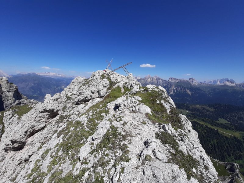 le due croci di vetta sono inclinate, provate dai venti e dagli eventi degli anni, un ammasso di tanta ferraglia quando basterebbe una croce più piccola e solida, è vero sono tanti gli interventi da fare sui sentieri normali dopo Vaia che forse piano piano penseranno anche alle cime, ma una riqualificazione in tempi brevi di questa spettacolare cima non sarebbe male, è solo il nostro parere personale. Cima Coldai si può raggiungere anche Dal Rifugio Tissi.