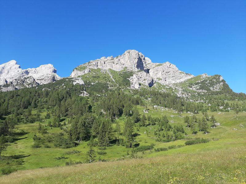 Stavolta però abbandoniamo il percorso più frequentato e raggiungiamo una cima, defilata e modesta, ma non proprio adatta a escursionisti inesperti. Da Palafavera m. 1514 s.l.m, dove abbiamo parcheggiato il camper, ci lasciamo il magnifico Pelmo alle spalle e prendiamo il classico sentiero C.A.I 564, una stradina bianca, che porta a Malga Pioda, m. 1816, posta sulla bella conca omonima.