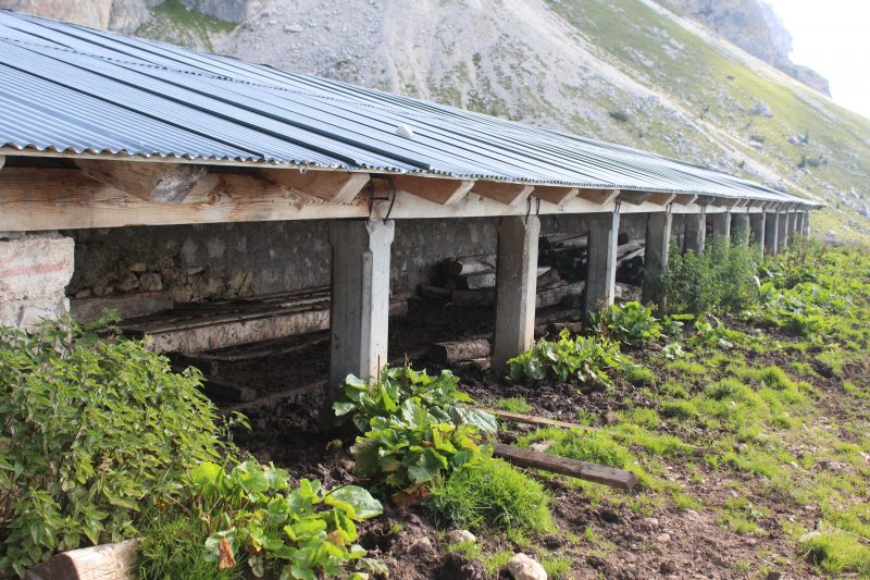 Il versante che guarda verso Borca di Cadore è una bellissima valle, Val Sandolera, che ci attira con i suoi verdissimi pascoli, chissà se un giorno potremo percorrerla! Le nuvole a tratti si addensano, l’Antelao è completamente avvolto da un mantello brumoso, ma qui c’è ancora un po’ di sole e le mucche pascolano tranquille, proseguiamo. Da Forcella Roan, tralasciando gli altri sentieri del crocevia, proseguiamo diritti per la strada, segnavia C.A.I 458, l’unico tratto ripido per oggi, arrivando nella magnifica conca dove sorge la piccola Malga Prendera, risistemata ma chiusa. L’unico riparo in caso di maltempo è costituito dalle tettoie delle due lunghe stalle, piuttosto ingombre di legname, da condividere e contendere con la mandria di manzette che ora pascolano qui attorno. Qui la stradina termina e il sentiero prosegue verso Forcella Ambrizzola, verso il Mondeval, il passo Giau, percorsi a noi noti che non ci stanchiamo di ripercorrere, tanta è la loro bellezza. Oggi noi ci fermiamo, per non lasciarci tentare di andare oltre, forse il tempo terrà, forse no, facciamo subito dietro front e ritorniamo al Rifugio Città di Fiume e poi al nostro camper dove, ormai al coperto, ci raggiunge la pioggia.