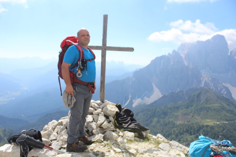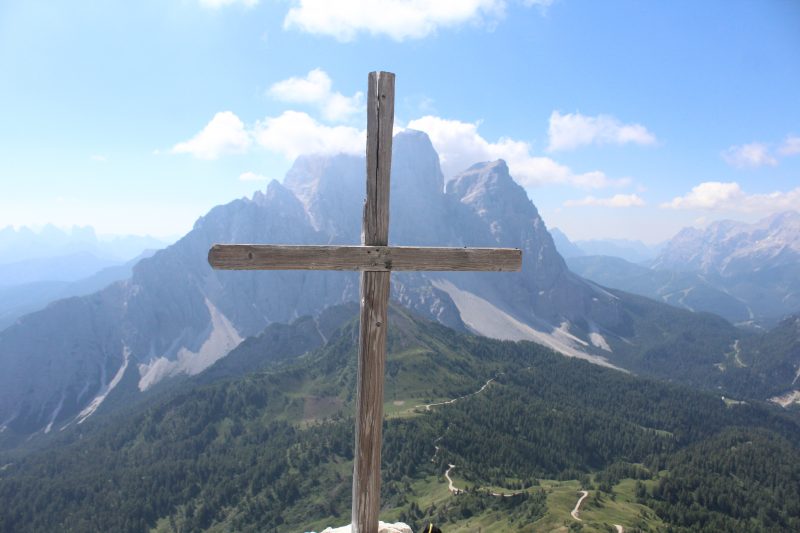 Il percorso è accidentato, non lo consigliamo a nessuno che non abbia zoccoli da camoscio, faticosamente guadagniamo il punto in cui ci innestiamo sulla traccia che sale in diagonale il ghiaione. Un ultimo breve tratto erto e friabile ci porta alla forcella tra il Becco di Mezzodì e la Rocchetta, da qui in poi il percorso è molto più agevole! Dalla sella prendiamo fiato, il panorama è già bellissimo, scorgiamo il Rifugio Palmieri con il laghetto accanto, le guglie della catena di Croda da Lago e tanta altra roba che ci riserviamo ammirare con più calma dalla cima. Ci lasciamo alle spalle il vicino torrione del Becco di Mesdì (Mezzodì) e ci incamminiamo a destra risalendo la spianata rocciosa ma con ampi spazi prativi e molto panoramici. Raggiungiamo la vetta, segnata da una piccola croce, della Rocchetta di Prendera, m. 2496, la più alta e la più facile da raggiungere delle quattro rocchette che dal basso ci sembravano un baluardo roccioso irraggiungibile.
