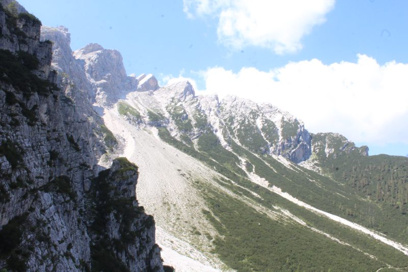 Sacco in spalla, dopo un ultimo sguardo alla baita proseguiamo lungo il sentiero che tra roccette e baranci ci porta fino alla piccola Forcella de le Caure (capre) con altri magnifici scorci sulle cime. Il nome è appropriato, bisognerebbe proprio essere capre o camosci per saltellare giù per il ripido canalino, noi scendiamo con attenzione e raggiungiamo i ghiaioni “Van dei Gravinai” che scendono dalle pareti del San Sebastiano. Il percorso prosegue in cengia sulle ghiaie, assolato e panoramico, fino a raggiungere la Forcella della Val dei Barance, m. 1688 s.l.m. Qui per poco non sbagliamo strada, il sentiero 536 prosegue per il Passo Duran mentre la nostra traccia CAI 539 (non avevamo notato il segnavia sul bivio) prosegue a destra verso un pulpito panoramico e poi scende a lungo nel bosco fino a raggiungere il Col de le Ole m. 1436. Abbandoniamo l’idea di raggiungere da qui il laghetto del Vach con la bella cascata che lo sovrasta e decidiamo di proseguire per la minuscola frazione di Colcerver, m. 1221 s.l.m, collocata su un costone alle pendici orientali del Col Baion.