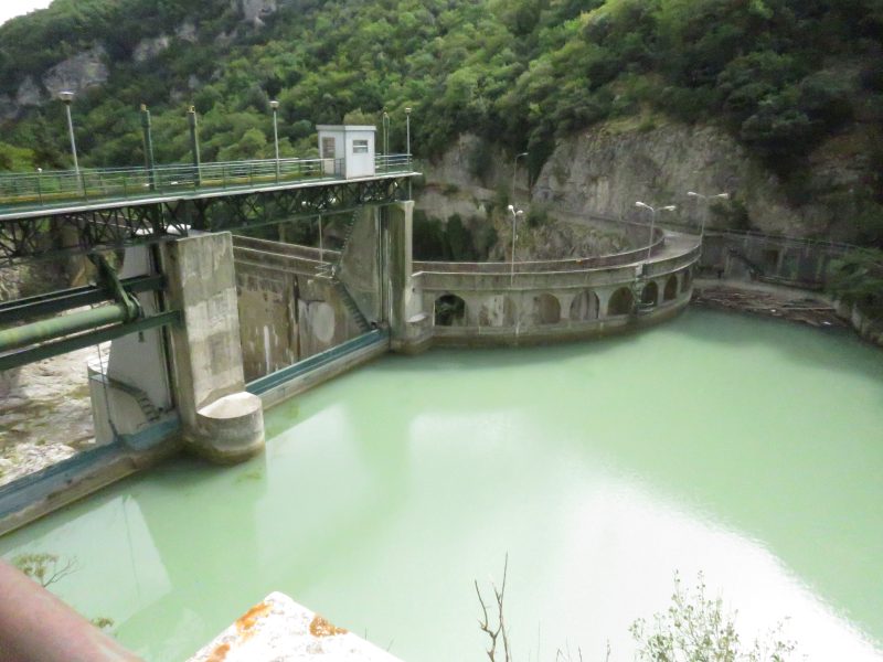 Interessante ci è parso il “Chiavicotto” un canale di drenaggio lungo 7 metri per 1,70 con la volta a botte che permetteva all’acqua che scorreva dalle pareti rocciose di raggiungere il fiume passando sotto la strada. Questi romani erano all’avanguardia. Raggiungiamo la diga del Furlo che sbarra il torrente Candigliano formando un lago che allagando la forra per circa 3 km impedisce di vederne la reale notevole profondità. Questo sbarramento fu finito nel 1922, si tratta di una diga ad arco alta 59 metri con un coronamento di 50 metri. L’accesso non è consentito, sarebbe stupendo poter ammirare la forra dall’alto del coronamento, ma anche dalla strada il salto dell’acqua che cade nella gola è impressionante. La centrale idroelettrica è posta più a valle, è stata costruita nel 1952 al posto di quella distrutta durante la II Guerra Mondiale, che si trovava proprio sotto la diga.