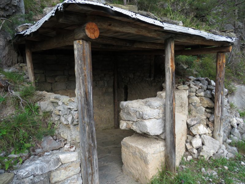 Raggiungiamo un cunicolo verticale, la scala a chiocciola di legno, deteriorata, è stata sostituita con una scaletta metallica che saliamo con cautela e arriviamo alla postazione radio. Appena fuori dagli ingressi, un sentierino sale in cengia lungo la parete rocciosa, a picco sul Rin de Soandre (Giao de Ciariè), ne abbiamo percorso solo alcuni metri, un’altra traccia scende sempre rasente le rocce nella direzione opposta e continua nel bosco, in direzione della vecchia strada per il Comelico, una terza cala ripida verso il torrente che per curiosità raggiungiamo.