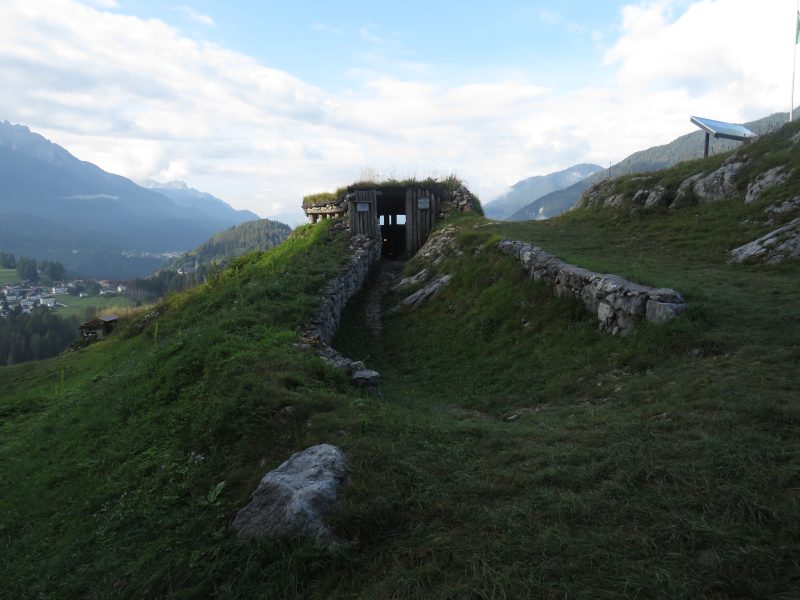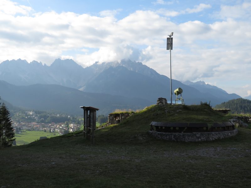 Durante la Prima Guerra, il “punto di appoggio” di Col Ciampon, a quota 1050, fu potenziato con postazioni coperte, cannoni, osservatori per artiglieria e poteva ospitare circa 120 soldati. Era una fortificazione di seconda linea, appartenente al sistema difensivo chiamato Fortezza Cadore-Maè di cui fa parte, per esempio, anche Forte Ricco a Pieve di Cadore. La visita a questo Museo Storico all’aperto ci entusiasma, trincee, ricoveri, magazzini, sono stati attentamente ricostruiti, all’interno delle postazioni troviamo le copie di alcune mitragliatrici, un cannone da 75, un mortaio, le munizioni e le granate sono invece residuati bellici (tutto reso inoffensivo), le foto dei vari tipi di cannone usati nella I Guerra, numerose didascalie e pannelli descrittivi.
