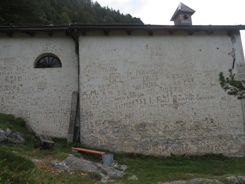 La fatica tutto sommato non è stata eccessiva e il panorama è splendido. Troviamo la base del pilone intermedio della grande teleferica che durante la I Guerra collegava la piana di Cialea con il Forte del Monte Tudaio, da qui potremmo proseguire sul sentiero 1328 verso Pramossei in poco più di un’ora e poi raggiungere Laggio per una mulattiera, ma preferiamo tornare alla chiesetta e scendere per il sentiero di andata, nel primo pomeriggio vogliamo visitare le opere militari a Rin de Soandre, lasciate ieri sera.