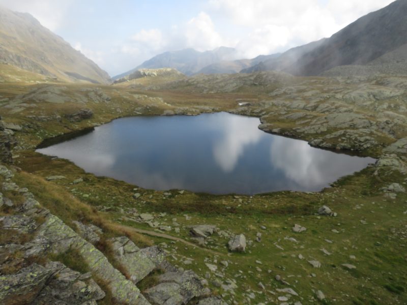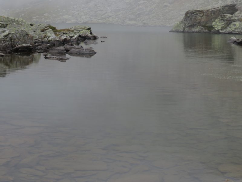 Al Rifugio, m. 2425 s.l.m, ci riposiamo pochi minuti, giusto il tempo per scambiare alcune battute con i gestori sul menù e i profumi di polenta e spezzatino che escono dalla cucina ma… al Lago Corvo …ci siamo portati il pranzo al sacco e in 10 minuti raggiungiamo il primo laghetto, i piccoli specchi d’acqua circostanti e infine il Lago Corvo Grande. Il lago è circondato dalle rocce arrotondate e dalle forme strane, l’origine glaciale di questi laghi è ben evidente, le nebbie che ora nascondono e ora svelano regalano un’atmosfera magica a questo luogo, non ci resta che sederci su un masso sulla riva e contemplare i giochi di luce, le rocce e le nuvole che si specchiano sulle acque che cambiano colore.