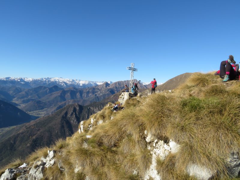 Il panorama è molto ampio, non solo sulla Val di Ledro con il lago e le Alpi di Ledro, ma anche sull’Adamello. Questa però non è ancora la vetta, la Cima D’oro si trova più a nord a 1802 metri di quota, e per raggiungerla ci vogliono altri 30 minuti di camminata in cresta e 112 metri di dislivello è bello il panorama che ci fermiamo spesso anche a osservare altre cime, altri itinerari possibili. Fantastica la veduta del trio di laghi da questo balcone panoramico, il Lago di Ledro, il Lago di Garda e il Lago di Tenno, per non parlare delle cime: a nord le lontane pareti del Brenta e andando verso est le più vicine vette del Bondone, dello Stivo, del Monte Altissimo di Nago, del Baldo, volgendoci verso sud il Monte Tremalzo e il Corno, a ovest le cime del Gruppo dell’Adamello, il Carè Alto… Facciamo una pausa per il pranzo al sacco. Non ci sono rifugi su questo monte, anche se è un itinerario ambito da molti, specialmente durante la fioritura delle peonie del Baldo e di tanti altri fiori di cui è ricco questo luogo.