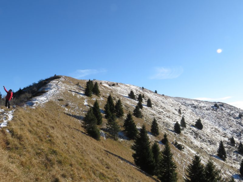 Qui un grande cartello segna l’inizio della Trincea, scavata dagli austroungarici durante la prima Guerra Mondiale, che ci porta con sentiero sempre ripido a diverse postazioni il sentiero passa dentro una Galleria con dei gradini in cemento, una volta uscito il sentiero sale sempre dentro alla trincea fino a giungere alla cima dell’osservatorio a 1690 m.s.l.m con la Croce.