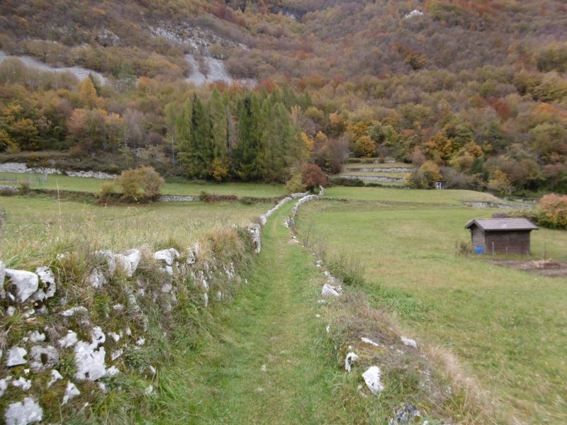 Prati ancora verdissimi si aprono nel bosco, ogni prato ha la sua casera, in genere frequentata stagionalmente e ogni casera ha la sua teleferica, i boscaioli e i teleferisti di Igne e di Soffranco, il paese sul versante opposto del Maè, erano famosi e ricercati per il loro ingegno e l’abilità con cui sapevano lavorare nei posti più impervi. Raggiungiamo una casera che ci offre un primo punto panoramico, un bel posto curato, con alberi da frutta e un pergolato di vite. Proseguiamo ancora verso destra, la mulattiera è contornata da alti muretti a secco e a lato ci sono le cataste di tronchetti di legno da ardere, pronti per l’uso invernale.