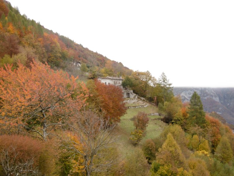 Continuiamo a camminare senza fatica, intorno a noi il bosco sfoggia i suoi accesi colori, troviamo lungo strada un posto un po‘ soleggiato e decidiamo di fermarci per il pranzo al sacco, è presto ma il freddo ci invita a ristorarci con un panino e un the caldo…presto sostituito da un buon bicchiere di ottimo vino offerto da Giuliano, generoso anche nel distribuire formaggio e salame. Dopo la sosta proseguiamo in leggera salita sull’altro lato della forra, raggiungiamo un prato, un ex pascolo con un piccolo ricovero di pietra, all’interno è incisa la data 1896. Scendiamo per traccia nel bosco cercando il sentiero “ufficiale” 486 CAI e lo troviamo, è ampio e lastricato con maestria, contornato da muretti a secco, supera dislivelli e asperità del terreno mantenendo la giusta pendenza, grazie alla sapiente posa delle pietre. Non possiamo che ammirare il lavoro degli sconosciuti artefici di questi manufatti. Continuiamo a scendere, troviamo un capitello con Sant’Antonio da Padova, che in qualche epoca deve aver soppiantato il precedente Sant’Antonio Abate, protettore del bestiame, molti di questi capitelli sono posti su entrambi i versanti della valle.