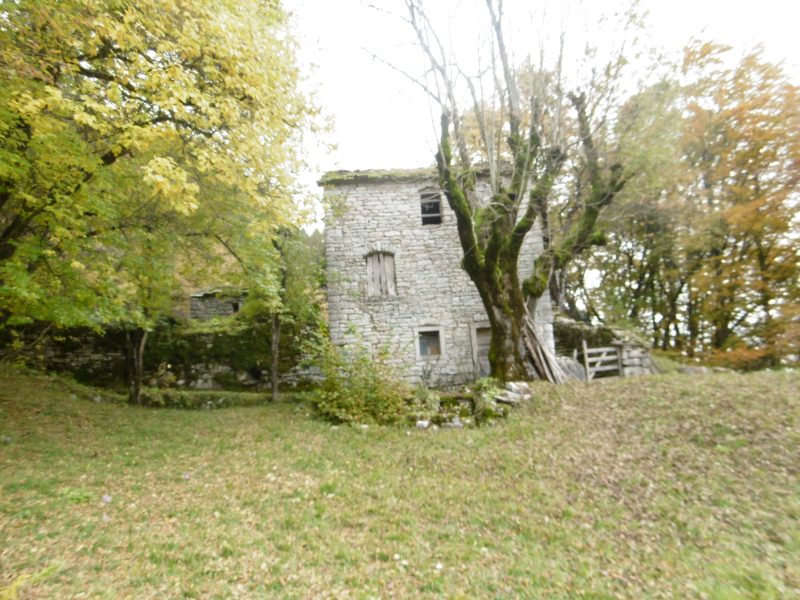 Attraversiamo un bel prato, sul pendio verso il bosco vediamo una sequenza di muretti a secco, un tempo ogni pezzetto di questa terra era coltivato fin dove possibile, un solco longitudinale nel terreno, protetto da sponde di pietre, ci fa capire che un tempo qui scorreva l’acqua per irrigare i campi. Ora è secco, lo superiamo passando sopra una solida pietra gettata a mo’ di ponticello e arriviamo a un gruppo di casere in sasso, Casere Le Gonte. Saliamo i gradini in pietra, sembrano abbandonate ma qualcuno coltiva ancora l’orticello fra le ex-abitazioni, ci sono la salvia, il rosmarino e il terreno è già ben zappato. Saliamo trovando una casera ben ristrutturata, dove una coppia è all’opera per gli ultimi lavori autunnali, il camino fuma e ci dà la speranza che questi luoghi non siano mai dimenticati. Poco dopo troviamo un bivio con un crocefisso e imbocchiamo la forestale che in costa ci porta in direzione nord ovest. Camminiamo più speditamente in mezzo al bosco, passiamo Val de Diane una forra boscosa e rocciosa dove, a monte della mulattiera, individuiamo tagliato nella roccia un vecchio percorso, lo raggiungiamo facendoci largo tra la vegetazione e troviamo due vasche di pietra. L’acqua non sgorga più nella roccia, solo un piccolo sgocciolio cade in uno dei manufatti, scalpellati a mano e non più liberati da foglie e marciumi.
