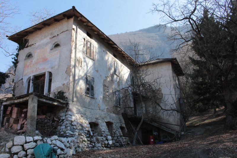Camminiamo costeggiamo i vigneti, proprietà privata, quindi restando rigorosamente sul sentiero ci alziamo, seguendo i numerosi segni rosso bianco rosso e giungiamo a un cippo che ricorda due alpinisti caduti dalla cascata che vedremo poi. D’inverno gela, formando una vela bianca appesa alla immensa parete, oggi è innocua, ma purtroppo quel giorno la vela decise di sventolare… precipitando i due poveri alpinisti alla base della parete. Ci inoltriamo nel bosco e iniziamo a salire l’erto e serpentino sentiero fino a incontrare un cancello con tornello che ci conduce ancora una volta in una proprietà privata. Il sentiero ci porta a quota 525 metri, nella radura coltivata a vigneto, del Cadino Alto, proprietà privata che concede il passaggio del sentiero 408 per i suoi terreni, arriviamo quindi alle casa colonica con un affresco sbiadito sulla facciata, non riusciamo a distinguere cosa sia dipinto, o quale sia il soggetto.